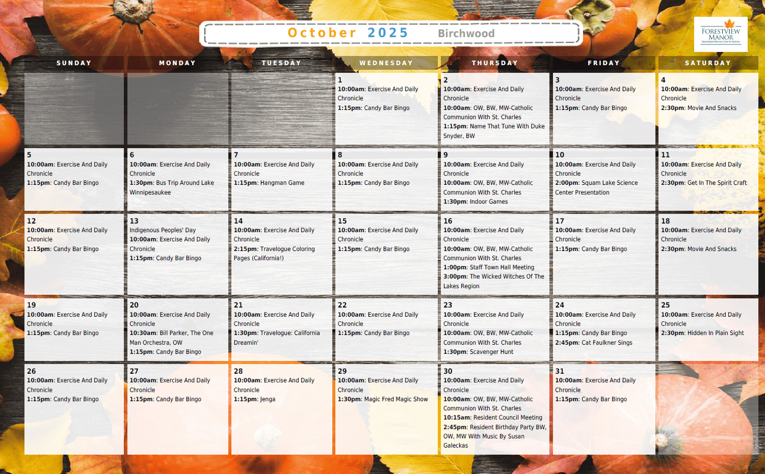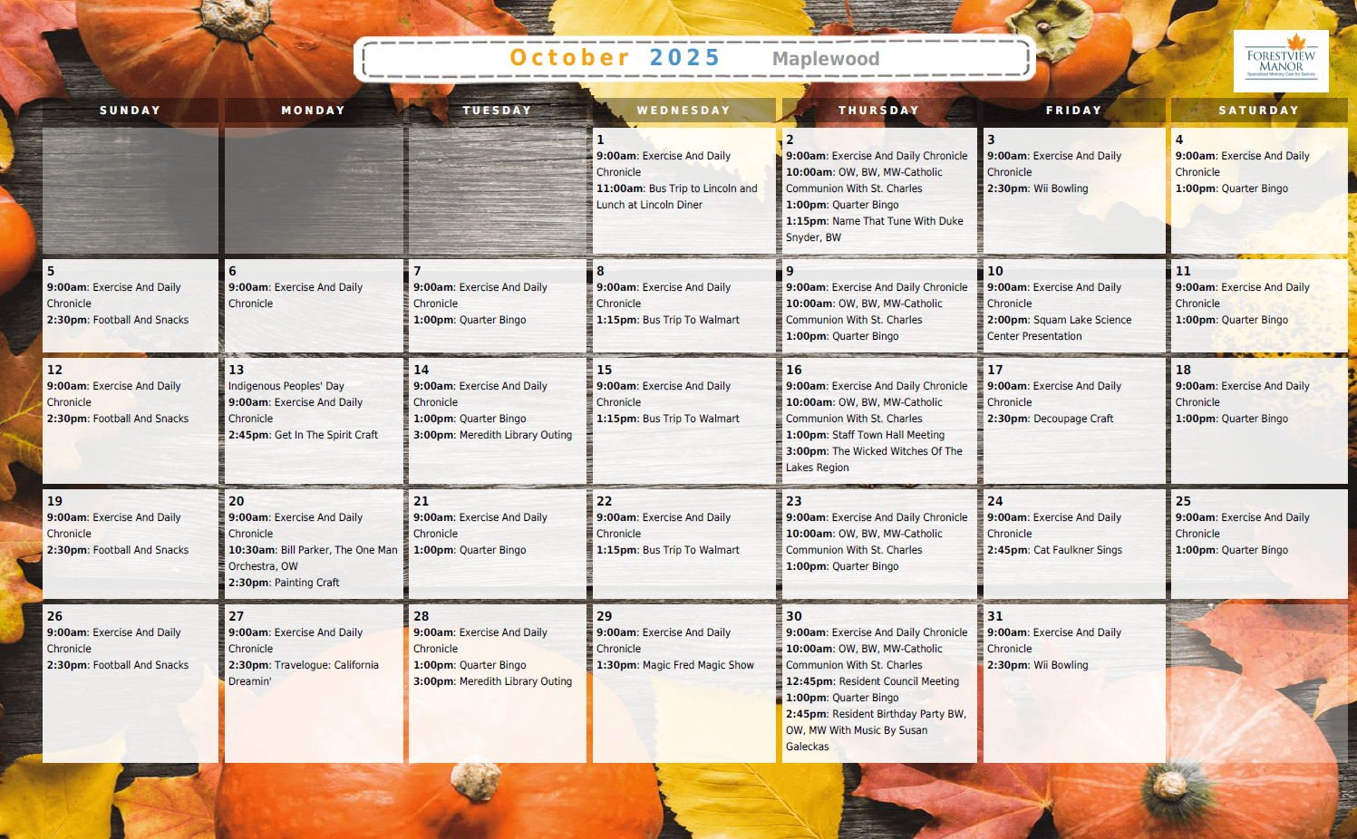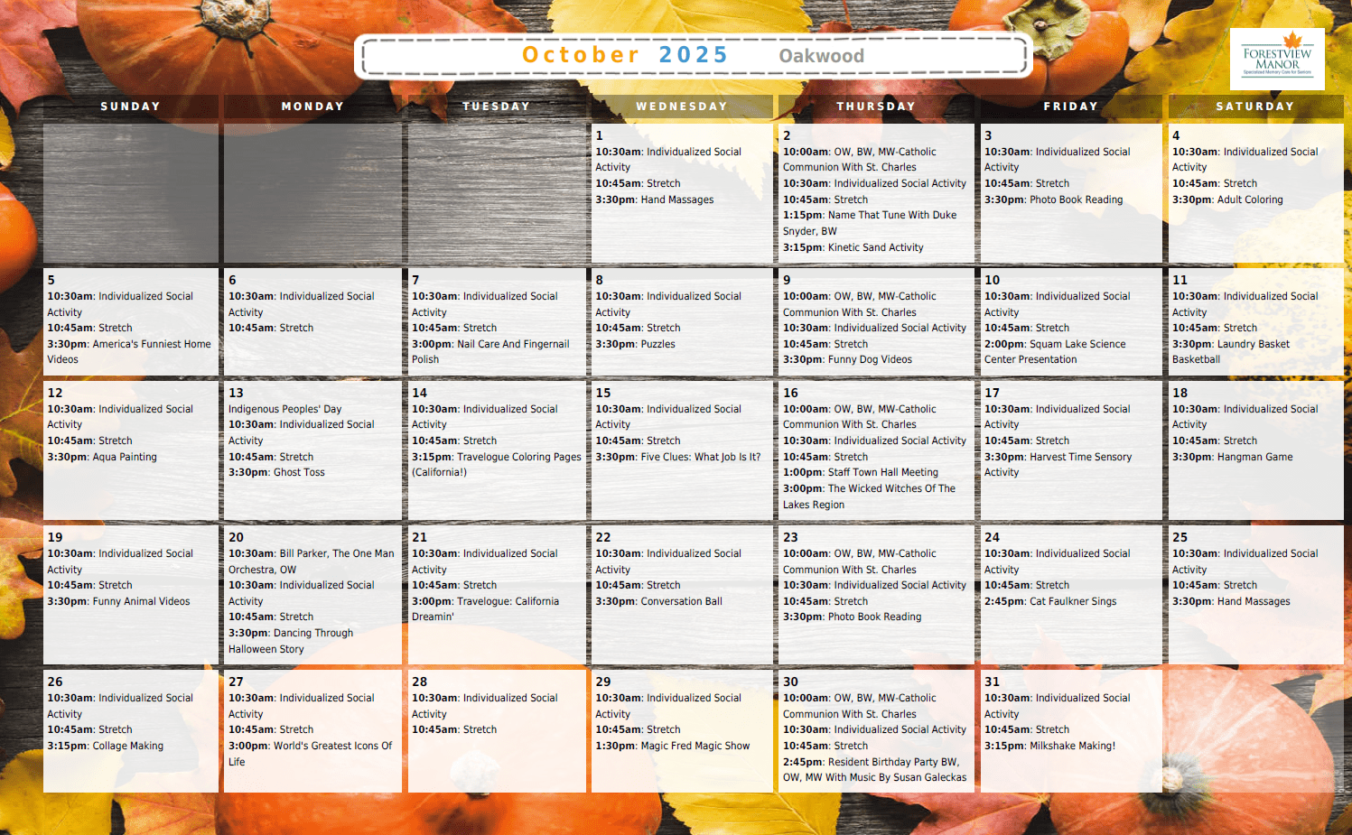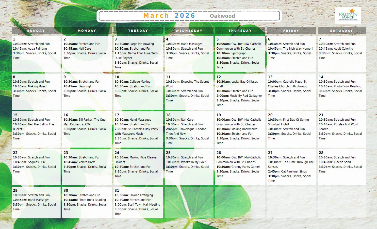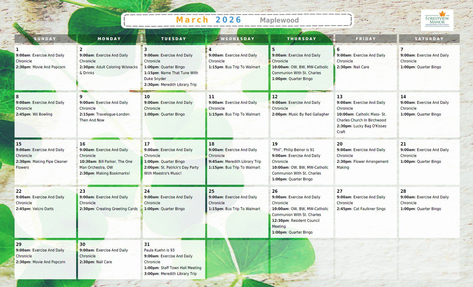 Forestview Manor is proud to offer purposeful and engaging activities for our residents based on individual interests and abilities. These activities, many occurring simultaneous to each other throughout the day, are designed to meet the social, physical, intellectual, emotional, and spiritual needs of our residents.